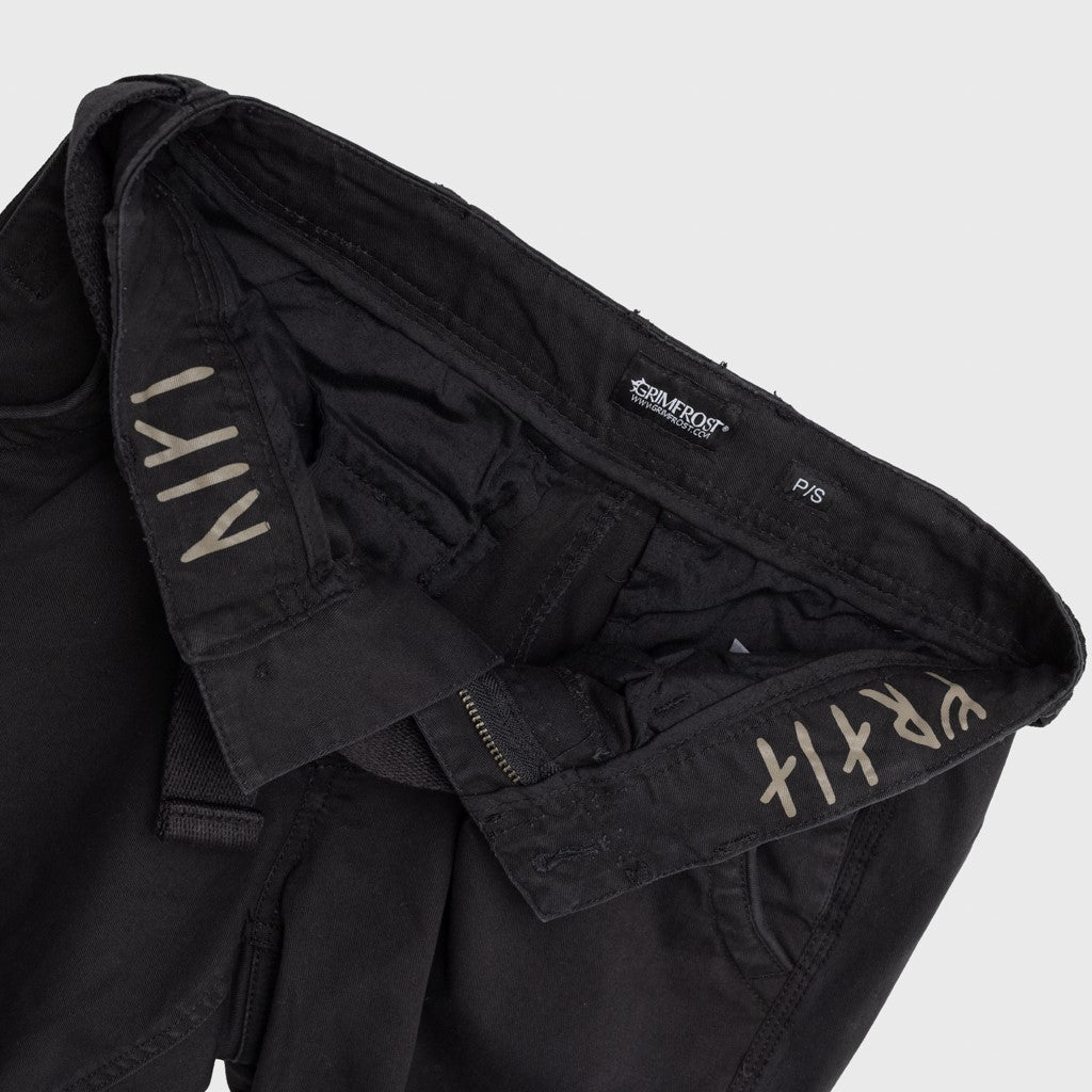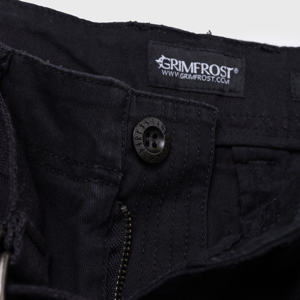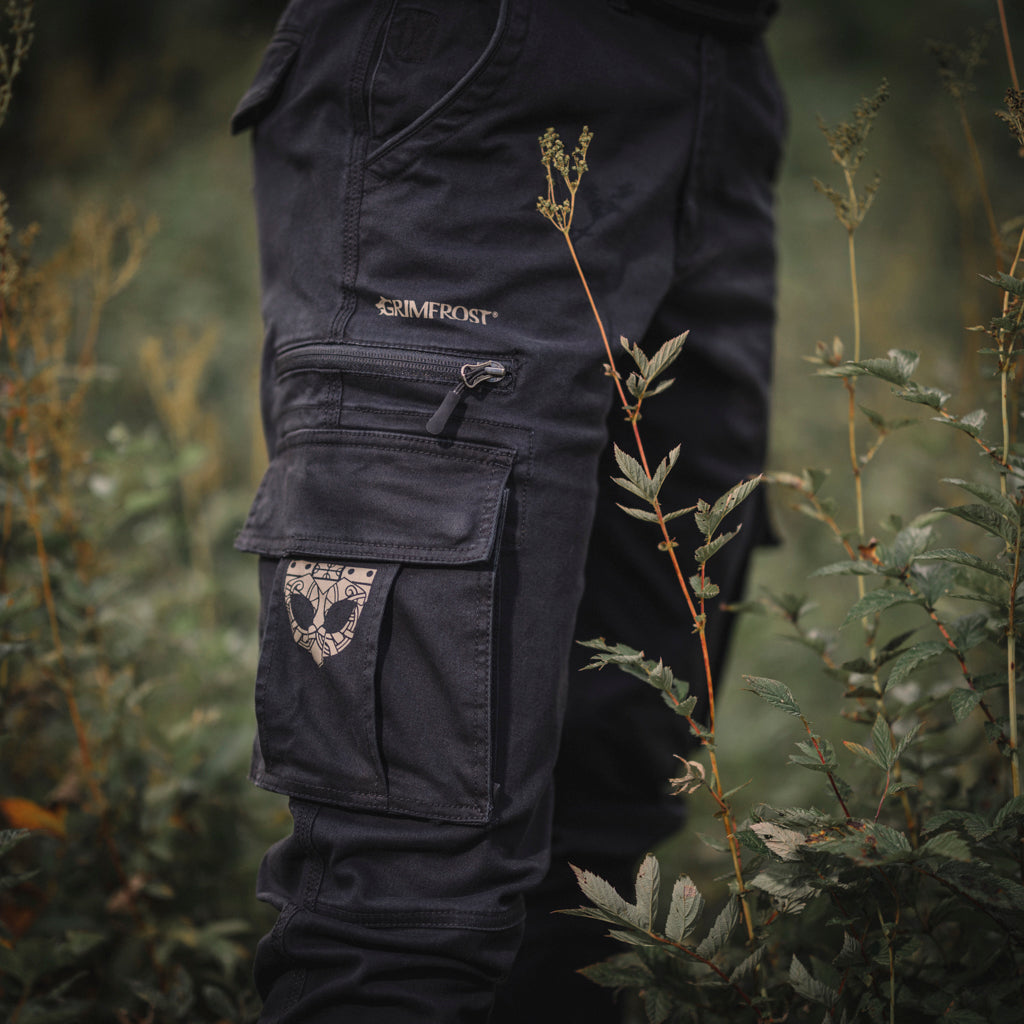Inspired by the past and made for the modern Viking, the pants come with a Viking twist. Grimfrost's helmet design is printed on the cargo pockets, whilst the backside belt loop has Viking artwork and "Grimfrost" in runes embroidered on it. The inside lining has "Freyja Viki" printed on it with runes, which translates to "Freyja Bless" - an ancient formula to keep you protected. To top things off, we have given each wooden button a Younger Futhark runic circle.
