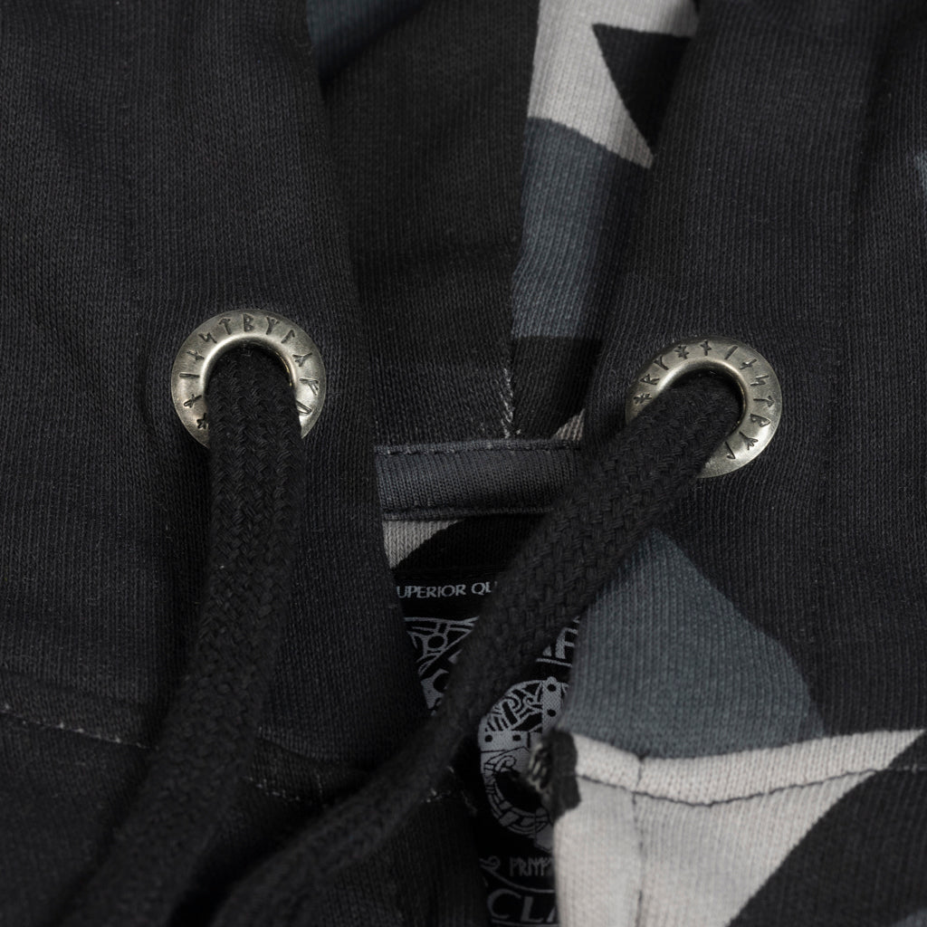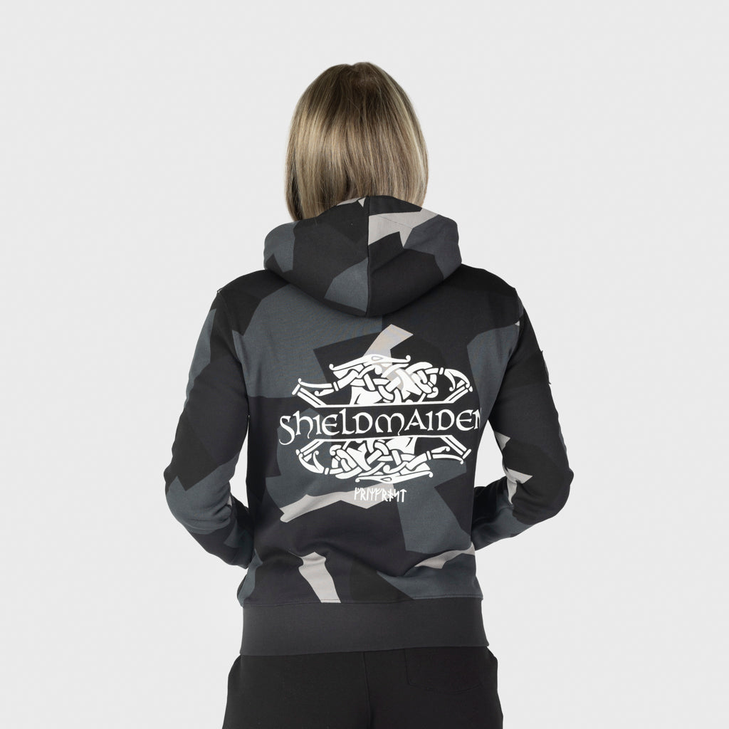 Premium full zip hoodie with a Shieldmaiden print in the famous M90 camo pattern used by the Swedish Armed Forces. It is custom-made for Grimfrost in soft, luxurious organic cotton. Even the dyeing and printing processes are fully organic, which is good for both You and Mother Earth. The hoodie comes with spacious kangaroo pouch pockets. To top things off, we have given the drawstring eyelets a Younger Futhark runic circle.
