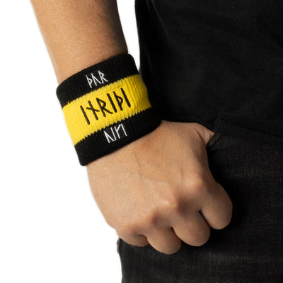 Comfortable wristband in absorbent fabric that will keep your hand dry in the gym, the heat of battle or when gripping a drinking horn. Written on it with the Younger Futhark runes is: "Þorr einriði viki". It is a Viking Age protective formula that translates from Old Norse to "Thor, Lone Rider, Bless" or "Thor, Lone Rider, Protect".